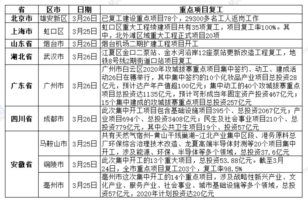 Mysteel統(tǒng)計(jì)數(shù)據(jù)顯示,截至3月26日,27省市規(guī)模以上工業(yè)企業(yè)復(fù)工率超過(guò)90%,江蘇、江西、湖南、重慶、新疆等省份人員返崗率超過(guò)90%。各地重大項(xiàng)目也陸續(xù)開工。